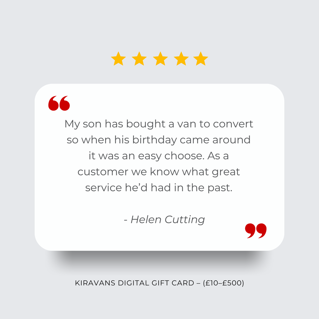 The Kiravans Digital Gift Card is a thoughtful, practical gift for anyone who loves life on the road. Whether they’re upgrading their campervan or planning a new conversion project, they can pick exactly what they need from our online store. Delivered instantly by email – ideal for last-minute gifting.