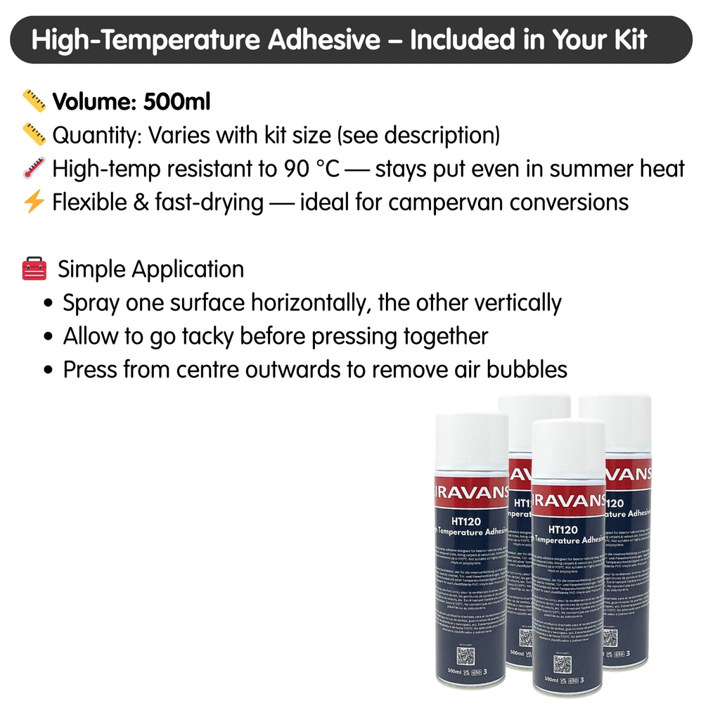 What it does: Our go-to spray for fixing the Thermal Fill securely, rated to 90 °C. Weâve included exactly the right number of cans for your van size so you can secure the fluffy insulation wherever needed without any guesswork.